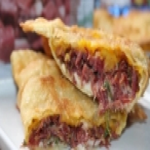 Pastel recheado com carne seca desfiada e queijo derretido, com massa douradinha e irresistível! 🥟🧀